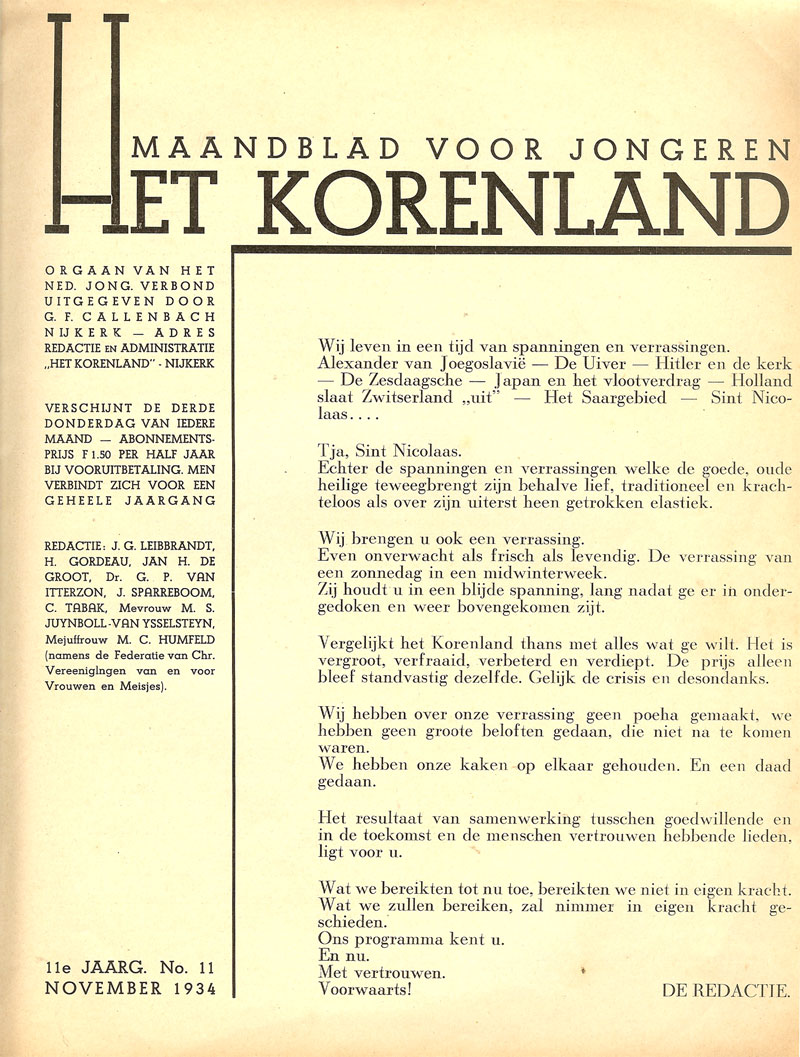 | Sint Nicolaas voorheen en thans door Herman Hana Artikel over de wandplaat Jeugd III De Spiegel in het maandblad Het Korenland, november 1934 |