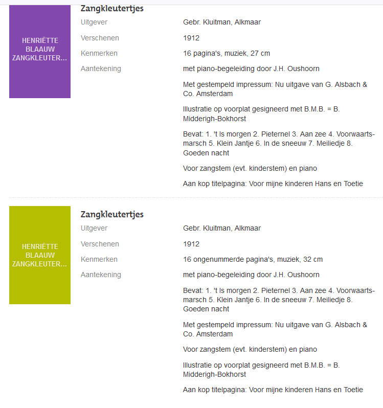 | 1912 | 1e | Zangkleutertjes, 8 kinderliedjes (Bibliotheek) |