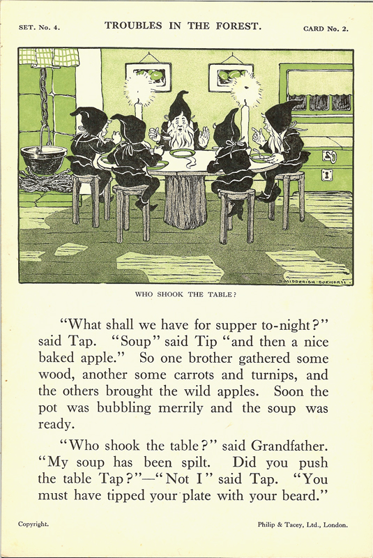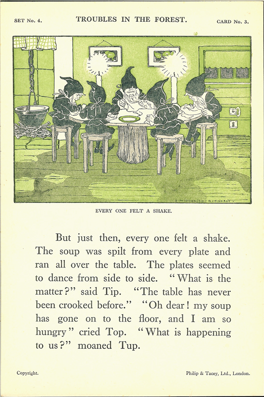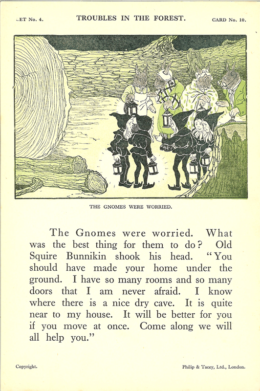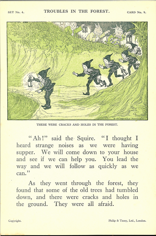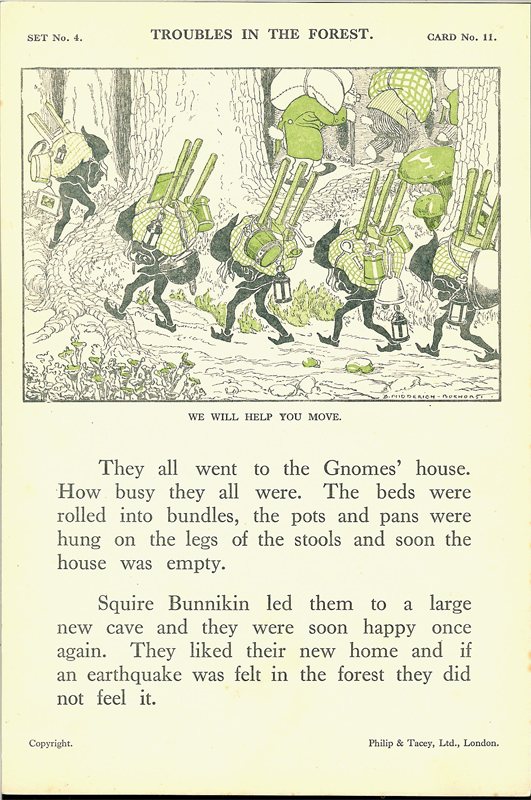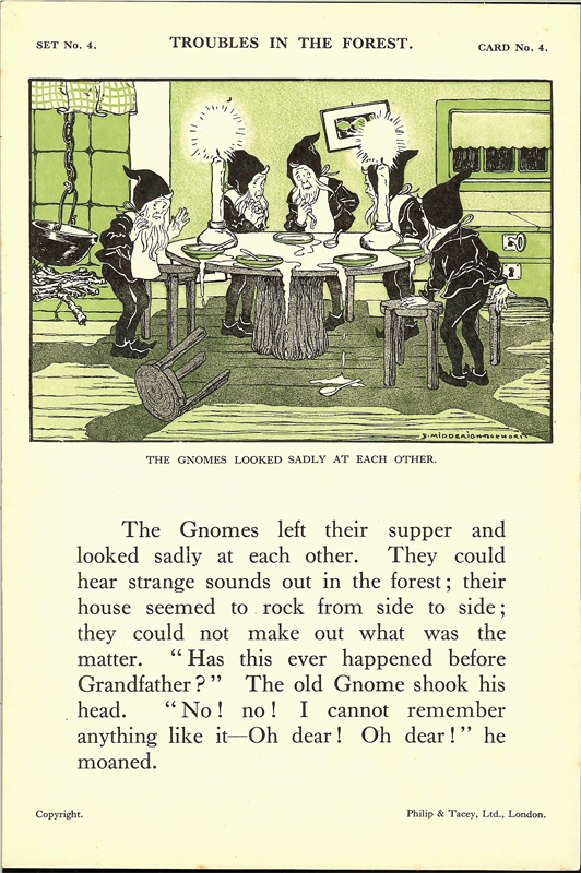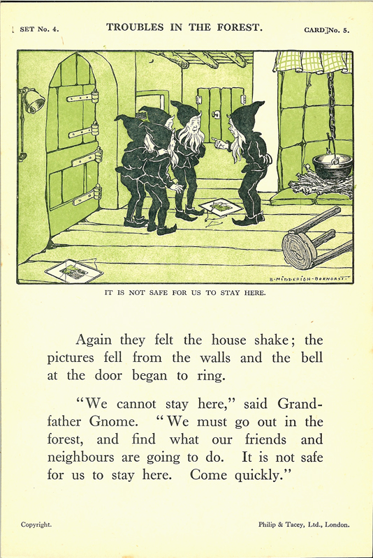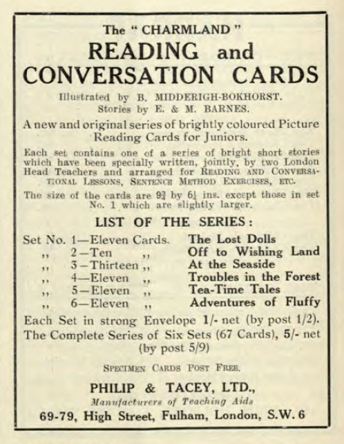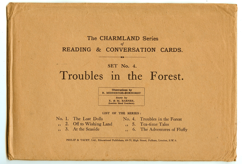 The Charmland Series Reading & Conversation Cards Een serie van zes enveloppen met losse leeskaarten met illustraties van B.Midderigh-Bokhorst Het zijn bewerkingen van de boekjes Voor School en Huis met versjes van Anna Sutorius, uitgegeven vanaf ca 1912. Uit het blad Child Life uit 1935 zie hieronder staat een uitvoerige advertentie van de uitgaven. In ieder geval is Troubles in de Forest een bewerking van Onrust in 't Bosch Hoogstwaarschijnlijk ziet het geheel er als volgt uit: