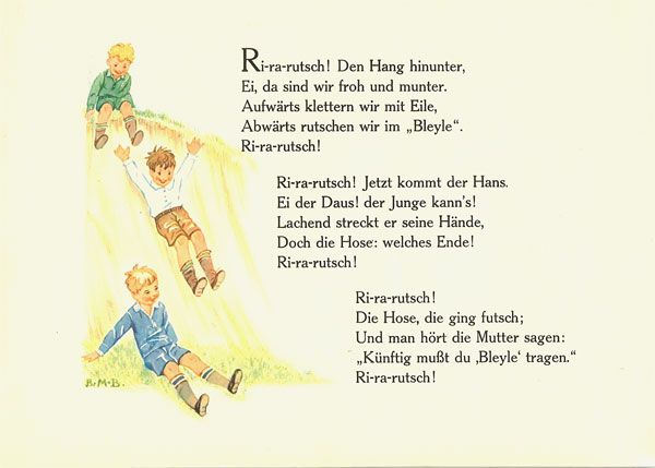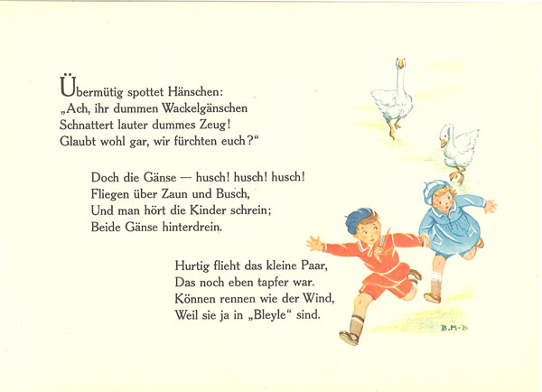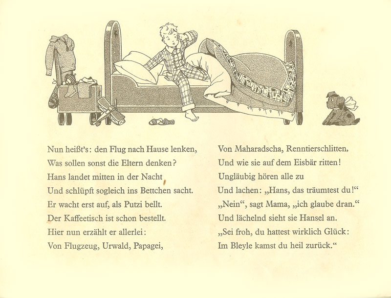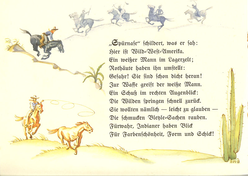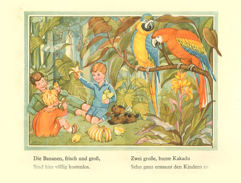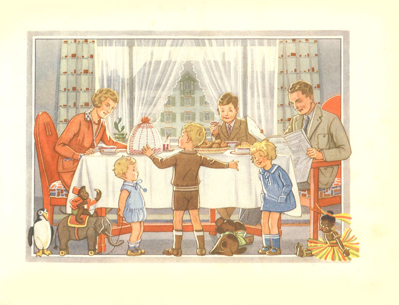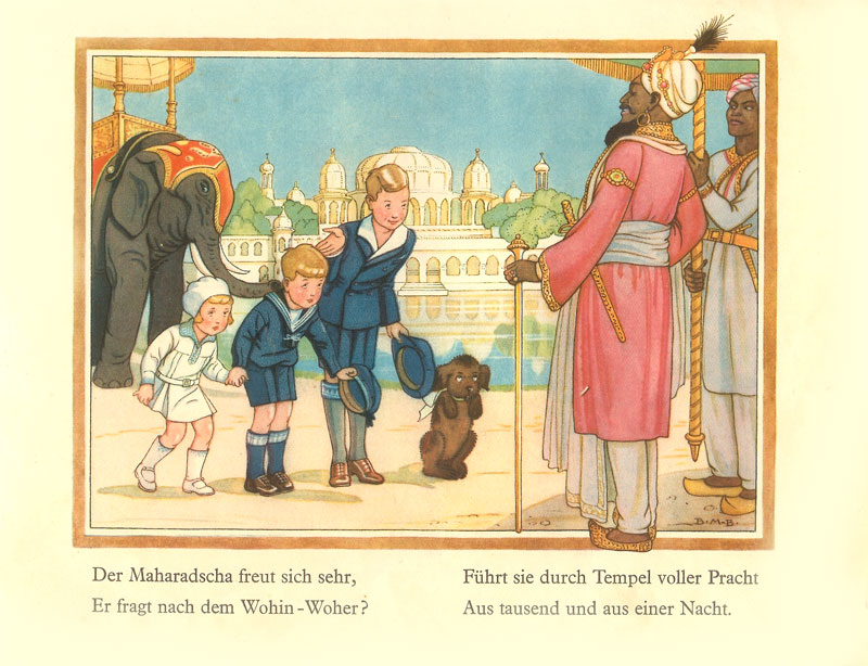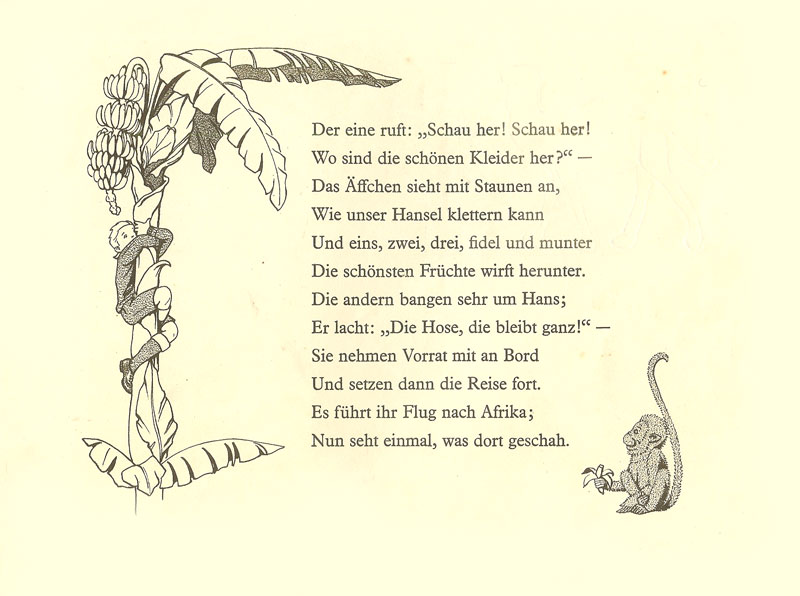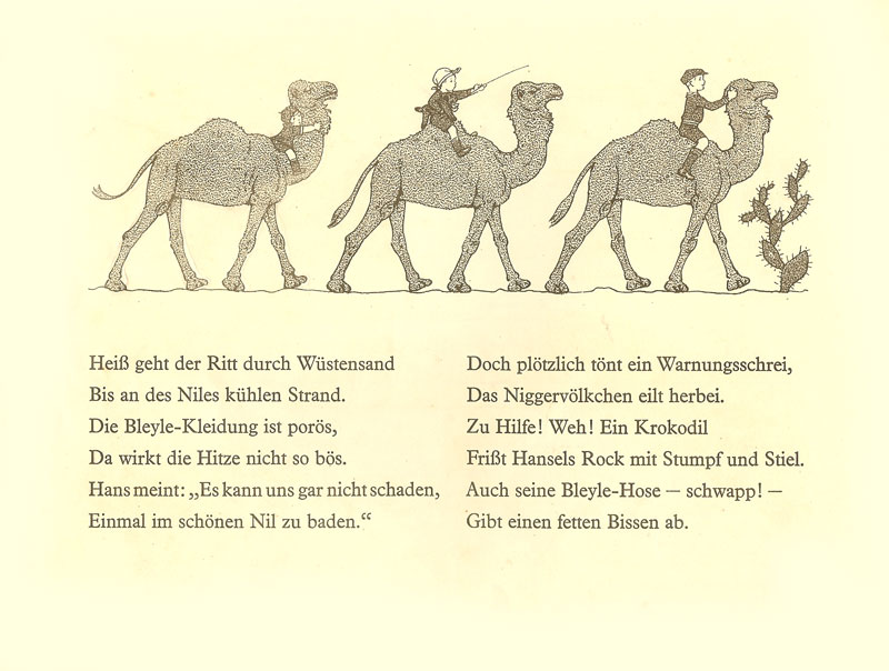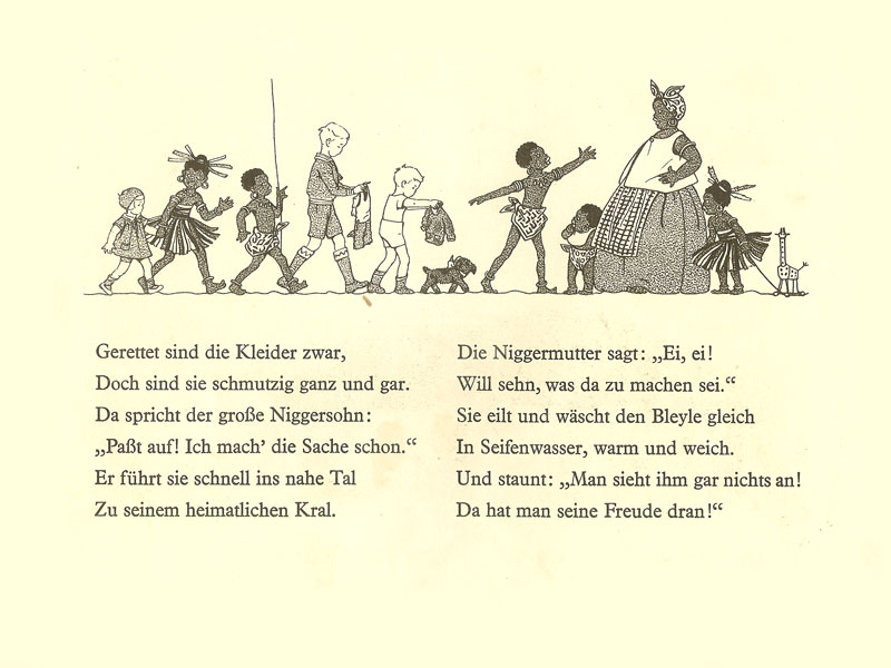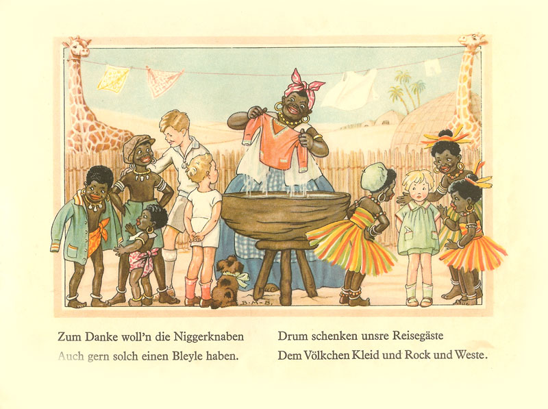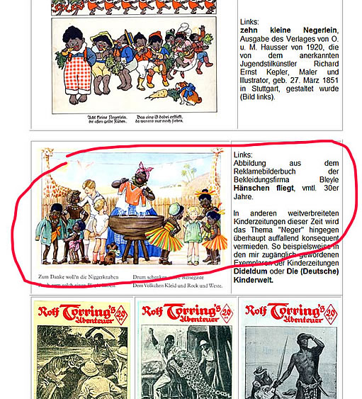 Zoals ook bij veel gedateerd illustratiemateriaal in Nederland het geval is, is ook in Duitsland - uiteraard volkomen terecht - veel kritiek op dit soort tekenwerk. Der Mohr hat seine Schuldigkeit getan... Die Darstellung Schwarzer in der deutschsprachigen Kinder- und Jugendliteratur Afbeelding uit Hänschen fliegt, pag 13 (verdere info volgt) |