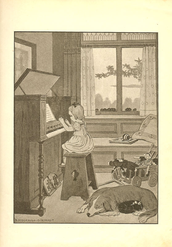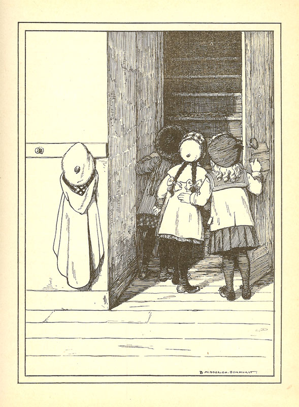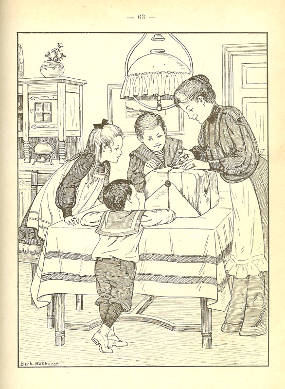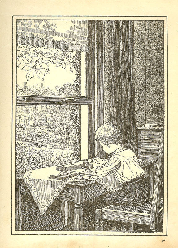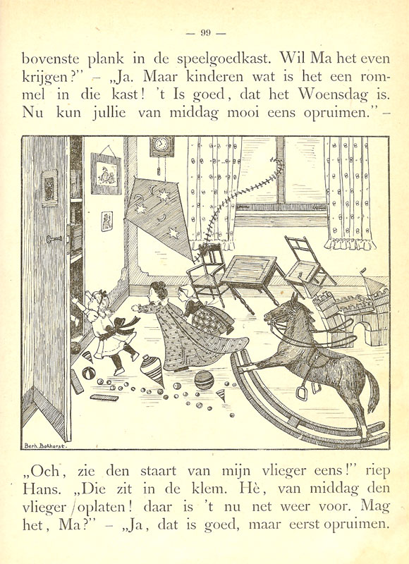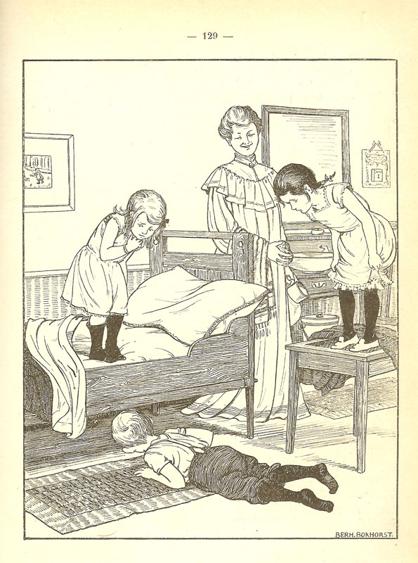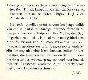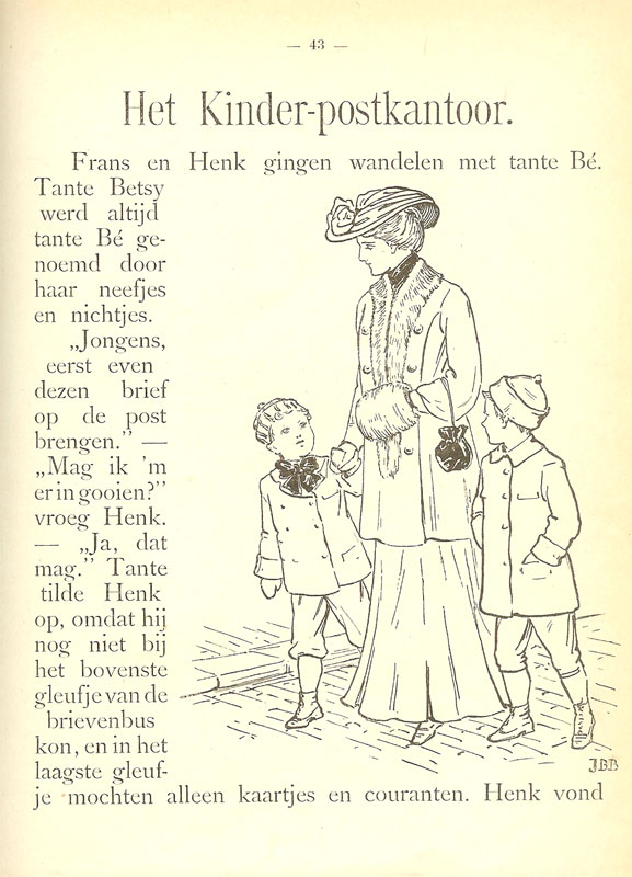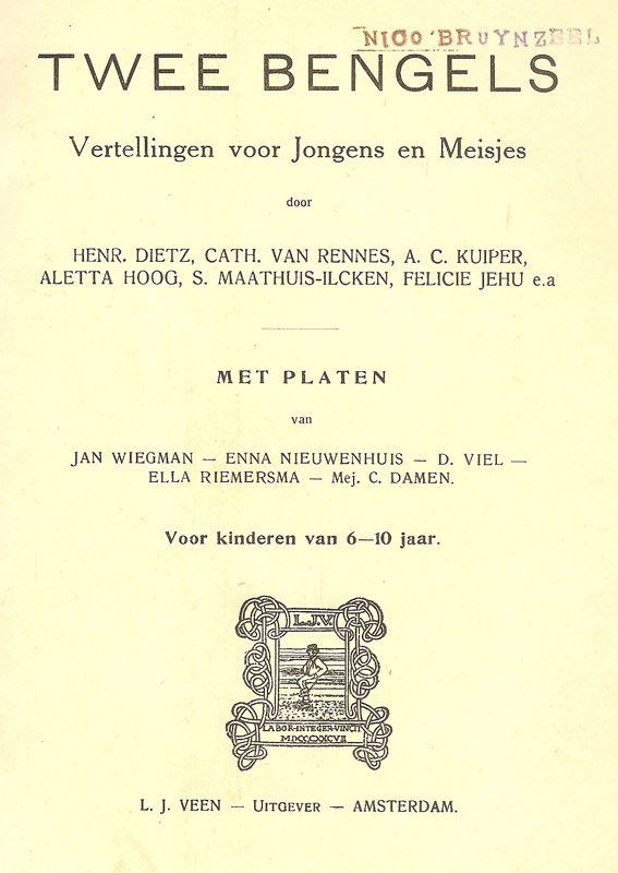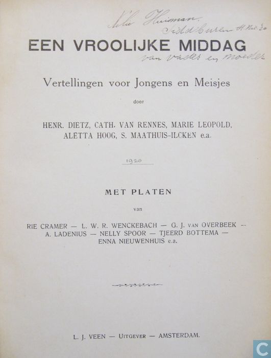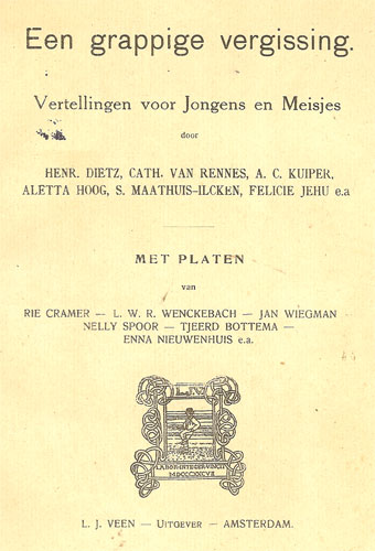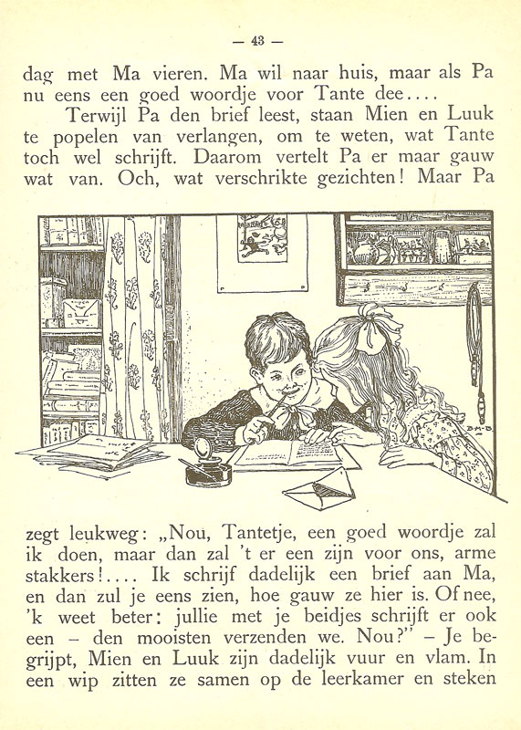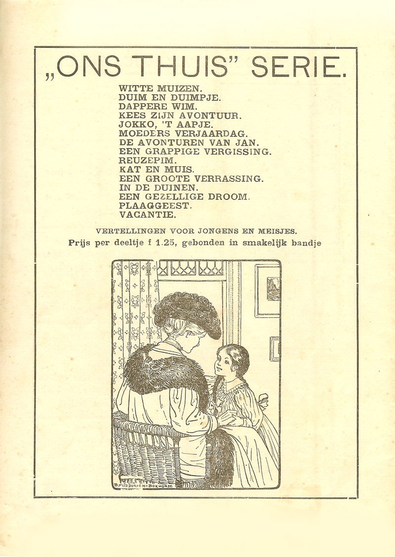 De originele tekening Ons Thuis 11e jaargang 1912-1913 dl 2 pag 43 bij het verhaal van Henr. Dietz: Een goed woordje bevindt zich beschreven in het Rijksmuseum (aanklikken), schenking van L.J.Veen in 1970. Los deel: Een leuke logeerpartij.