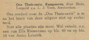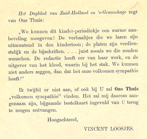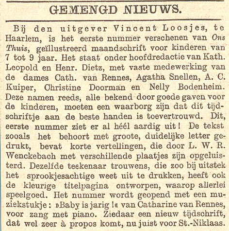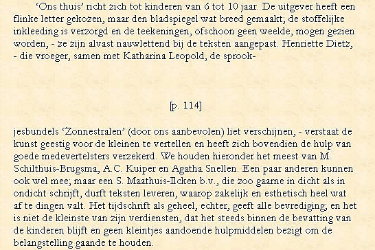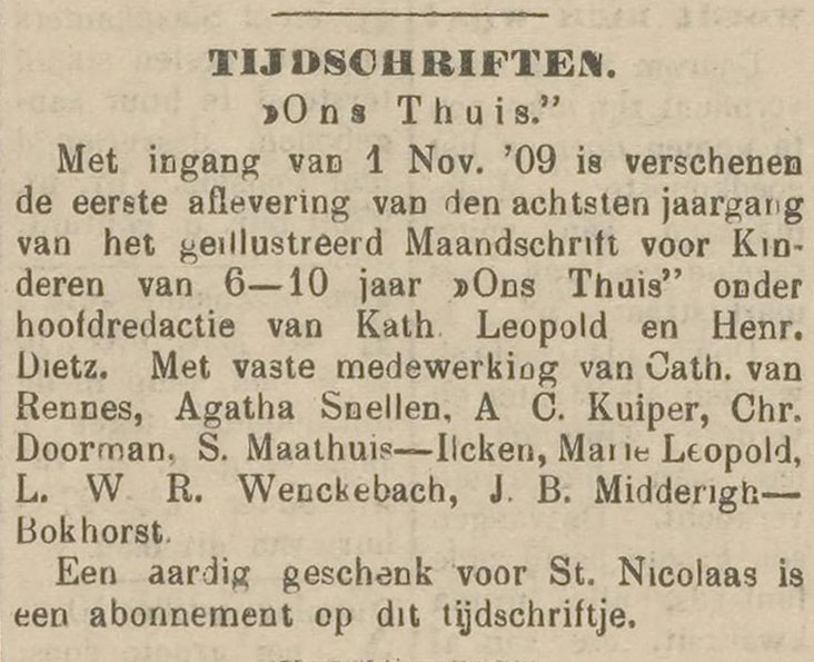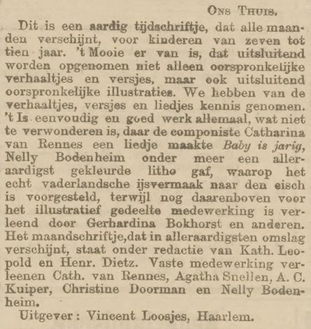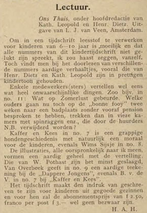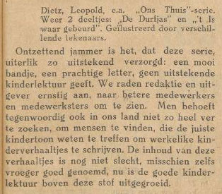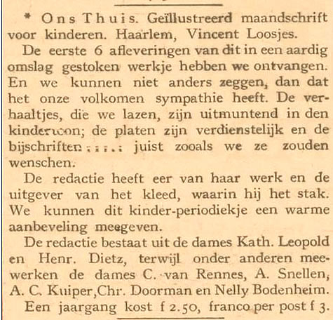 In 1928 verschijnt Over boeken voor kinderen door Hendrik van Tichelen - konservator van het Stedelijk Schoolmuseum te Antwerpen - waarin een alinea over het tijdschrift Ons Thuis en enkele auteurs daarvan.