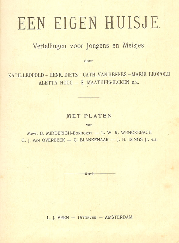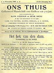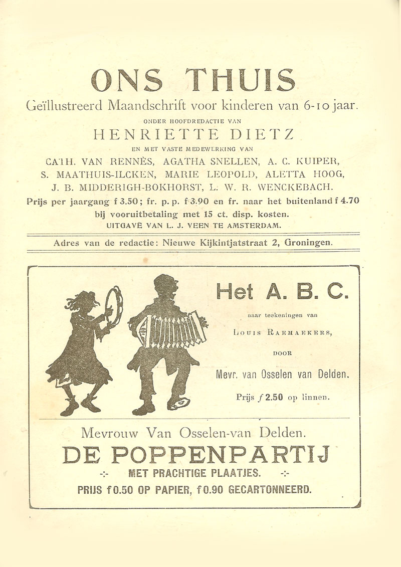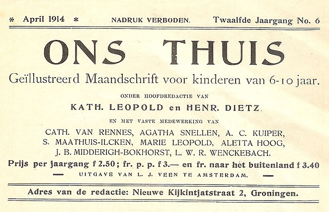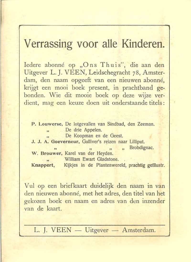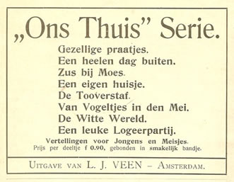 Er verschenen mooi gebundelde jaargangen, soms in twee of drie afdelingen, soms doorgenummerde boekwerken waarbij de omslagen en mogelijk andere redactionele pagina's en advertenties grotendeels of geheel werden weggelaten. De jaargangen worden 'Ons Thuis - Verhalen en versjes voor kinderen van 6-10 jaar' genoemd, verzameld door Henriette Dietz. Vanaf 1908 komen er deelbundels met een eigen titel naar één van de verhalen uit de bundel met als ondertitel 'Vertellingen voor Jongens en Meisjes'. Dan worden de auteurs en de illustratoren genoemd en het geheel is uitgegeven bij L.J.Veen - Uitgever - Amsterdam.