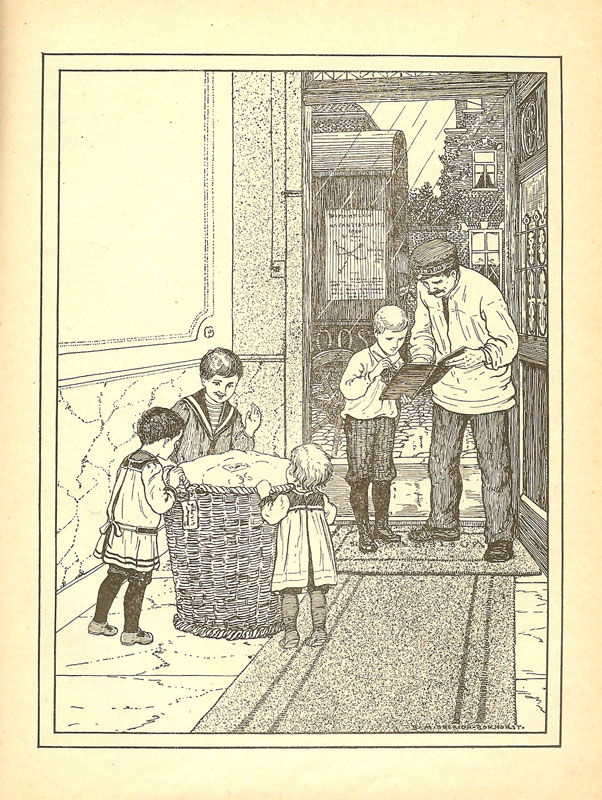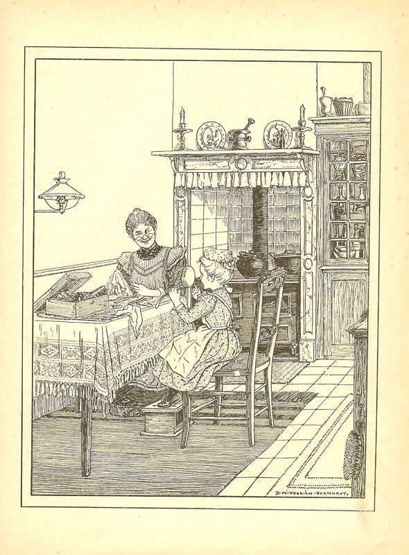 De originele tekening Ons thuis 7e jaargang 1908-1909 dl 1 pag 3 bij het verhaal van Marie Leopold: 1 November bevindt zich beschreven in het Rijksmuseum (aanklikken), schenking van L.J.Veen in 1970. Los deel: Winterprovisie.