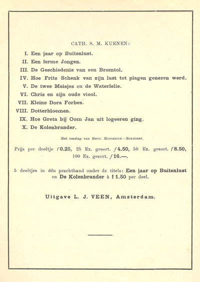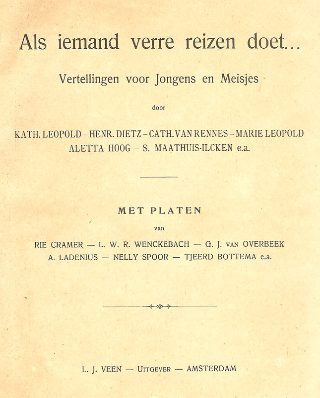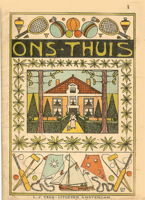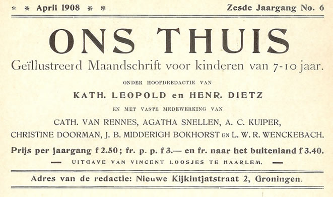 De originele tekening Ons Thuis 8e jaargang 1909-1910 dl 1 titelpagina van los deel Gezellige praatjes bij het verhaal van Kath. Leopold: Alleen er op uit bevindt zich beschreven in het Rijksmuseum (aanklikken), schenking van L.J.Veen in 1970. Los deel: Gezellige praatjes.