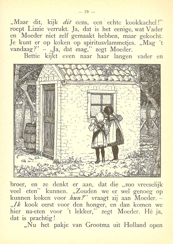 De originele tekening Ons thuis 9e jaargang 1910-1911 dl 1 pag 79 bij het verhaal van Aletta Hoog: Het geheimzinnige huisje bevindt zich beschreven in het Rijksmuseum (aanklikken), schenking van L.J.Veen in 1970 Los deel: Zus bij moes