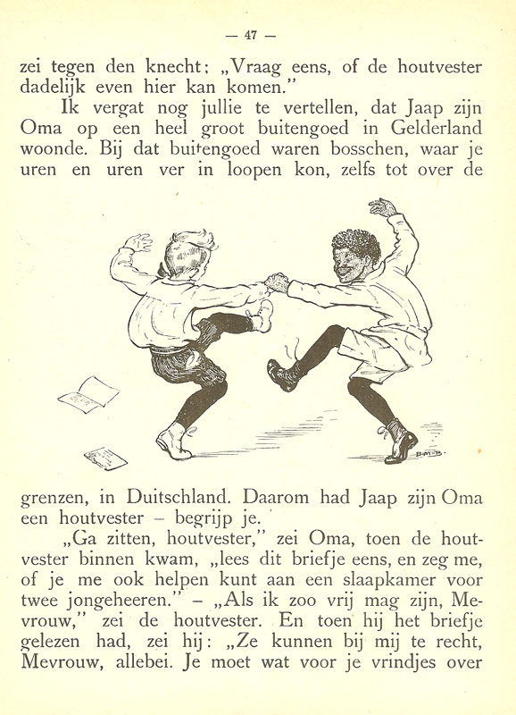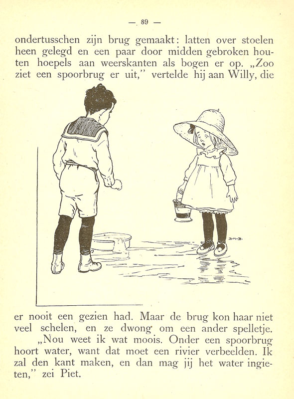 De originele tekening Ons Thuis 11e jaargang dl 2 1912-1913 pag 47 bij het verhaal van S.Maathuis-Ilcken: Van twee vriendjes bevindt zich beschreven in het Rijksmuseum (aanklikken), schenking van L.J.Veen in 1970. Los deel: Een leuke logeerpartij.