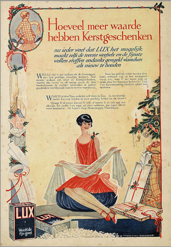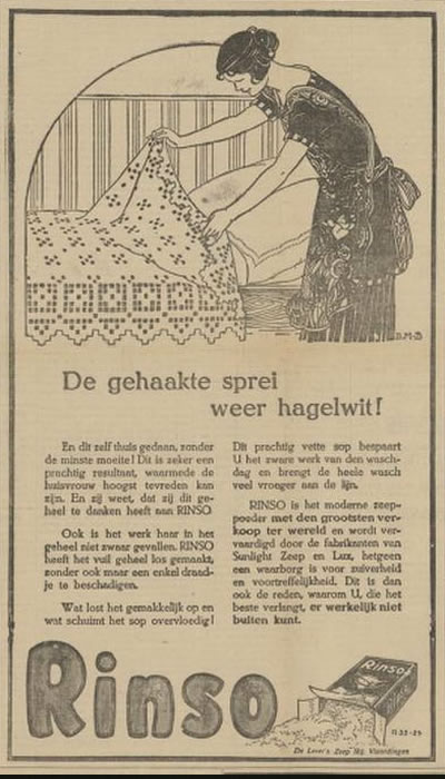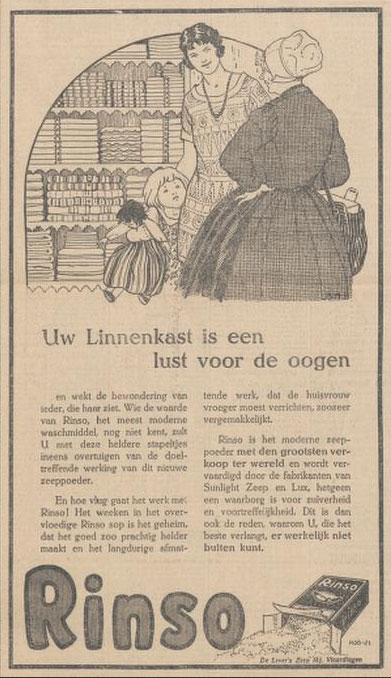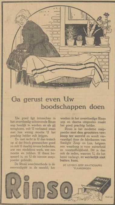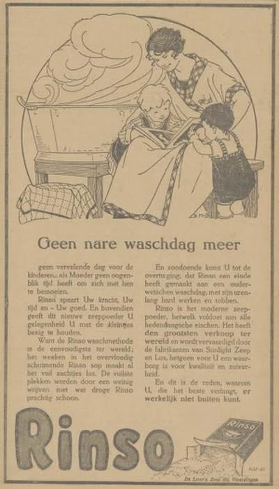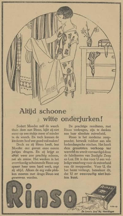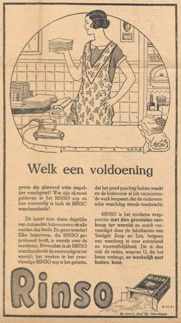 Naast de advertentie voor LUX-wasmiddel is er in 1925-1926 een reeks reclametekeningen voor het merk Rinso van dezelfde fabrikant Lever's Zeep Maatschappij te Vlaardingen, een thuiswedstrijd voor B.Midderigh-Bokhorst dus. Er zijn in ieder geval zes verschillende tekeningen