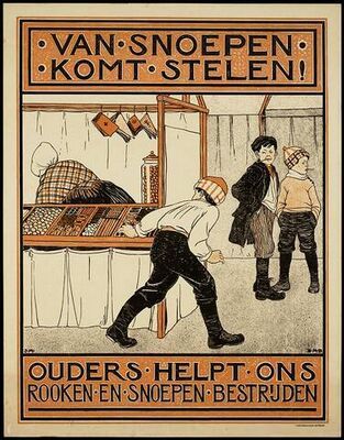 Zwarte letters op een gele achtergrond met in het midden een tekening van een marktkraam met snoep waaruit een voorlangslopende jongen snoep grijpt. Achter de kraam staan twee andere jongens met handen in de zakken en met een sigaret in hun mond.