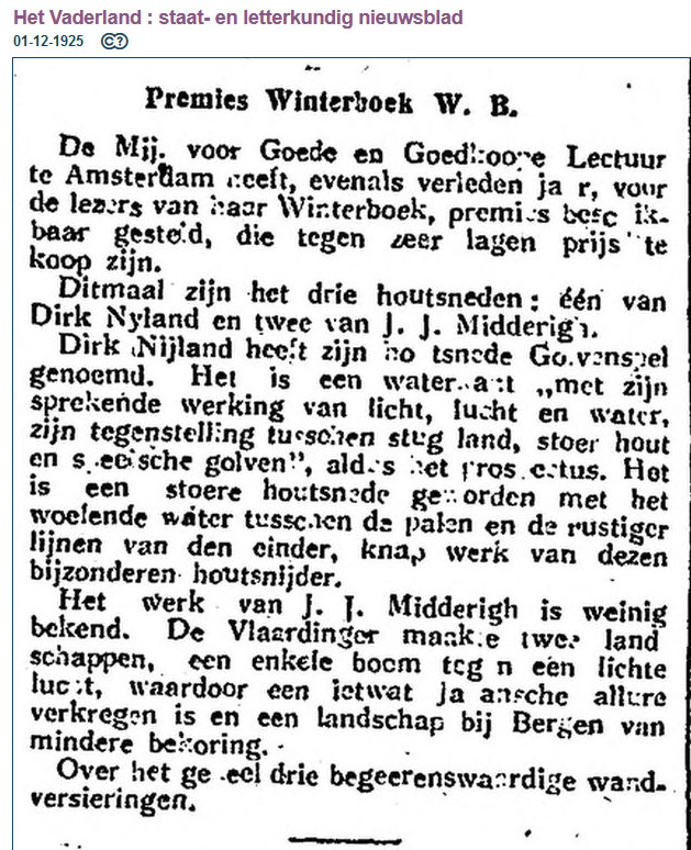 Volgens onderstaand artikel uit Het vaderland van 1 december 1925 moet er nog een tweede houtsnede van de hand van J.J. Midderigh zijn...... |
