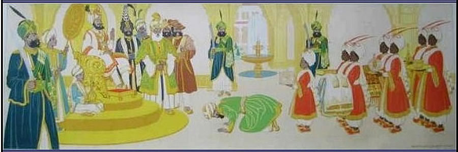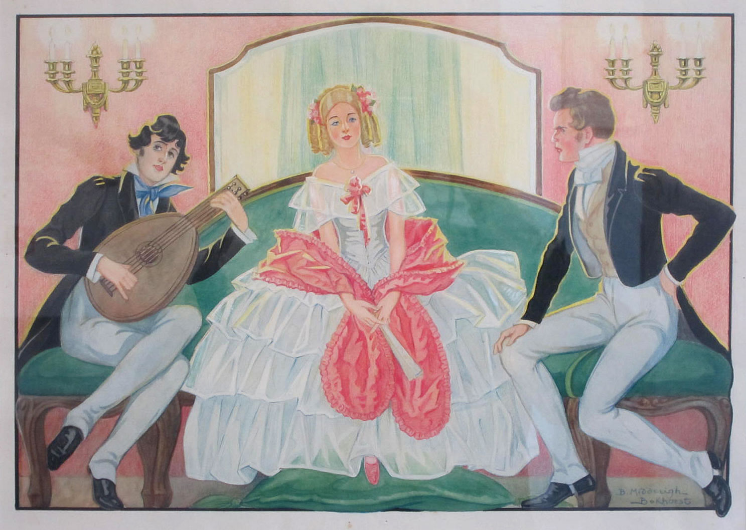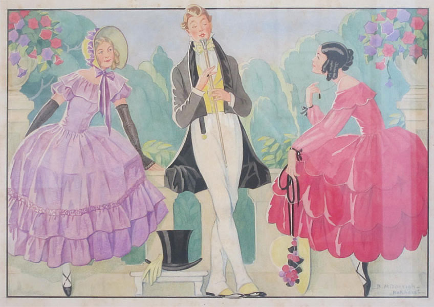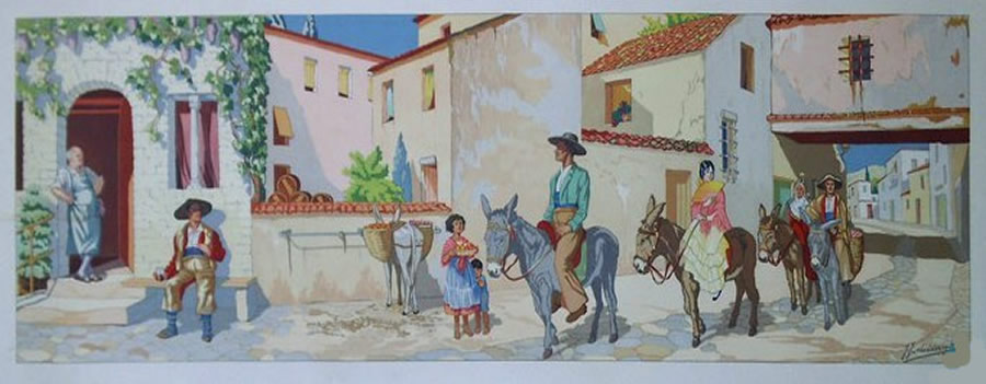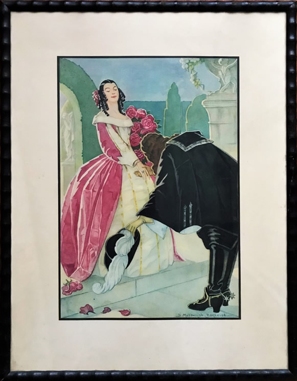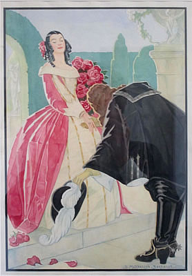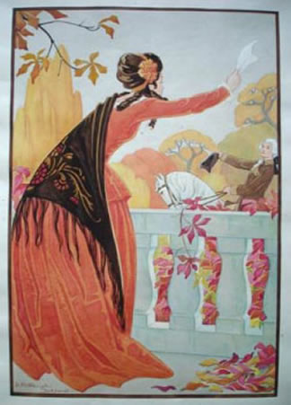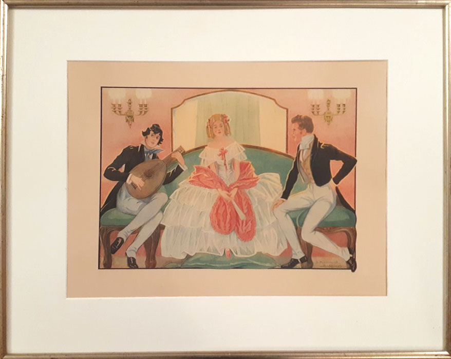 ![]() Meisje wuift met zakdoek naar markies op paard. Guoache - 40x28 |