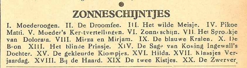 De ingebonden jaargangen van Zonneschijn Als genummerde ''Zonneschijntjes'' worden deelbundels uitgegeven, genoemd naar het eerste verhaal van het betreffende maandblad. Ook sommige andere nummers worden in de beginjaren op soortgelijke wijze apart uitgegeven, mogelijk waren het uitgeversrestanten. De opgeplakte omslagillustraties zijn soms toepasselijk, soms ook willekeurig. |